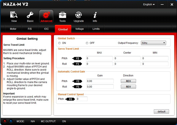 Сервоприводы подключаются в каналам F1 и F2 полетного контроллера. Вся настройка происходит на вкладке Advanced-Gimbal: