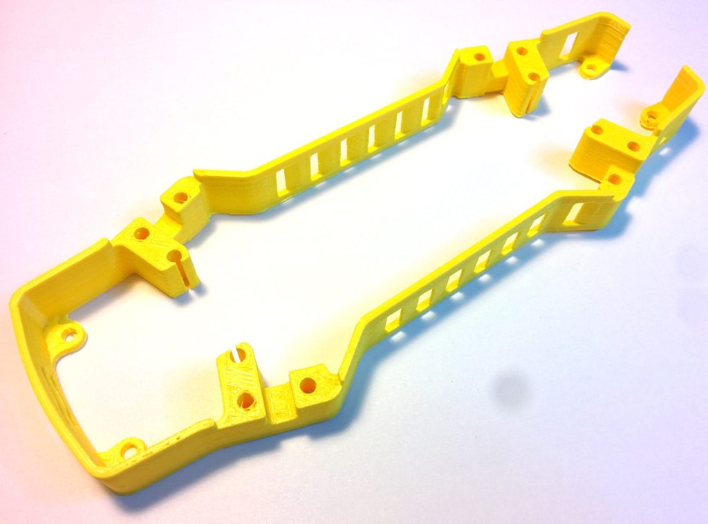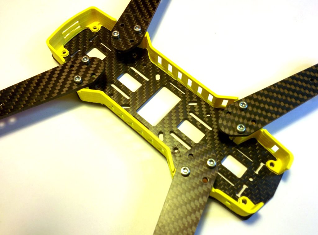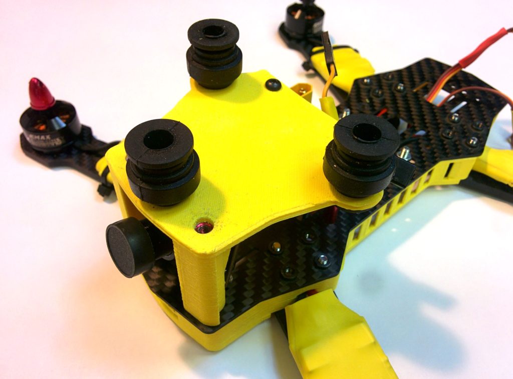 Многие стараются уйти от такого расположения элементов. Электроника убирается внутрь тушки аппарата на уровне лучей, а аккумулятор ставится на «первом этаже». Для этого необходимо напечатать вот такую проставку: