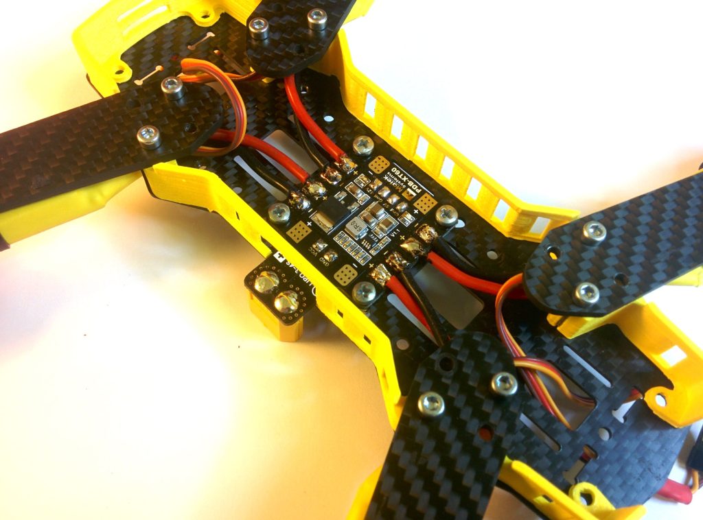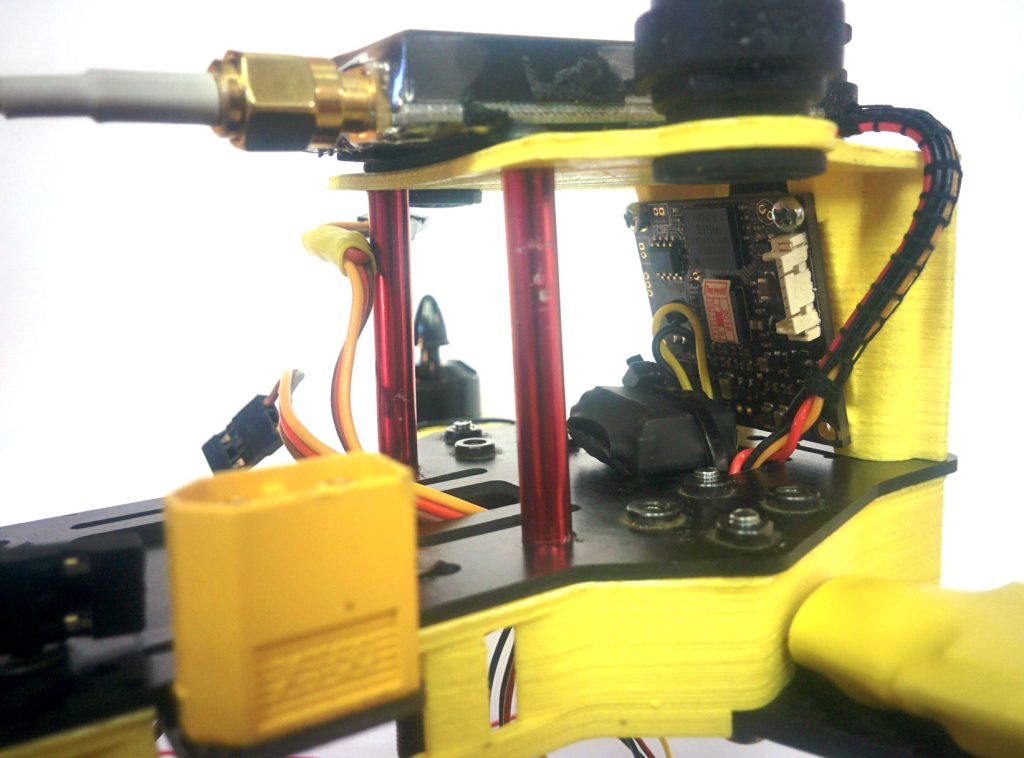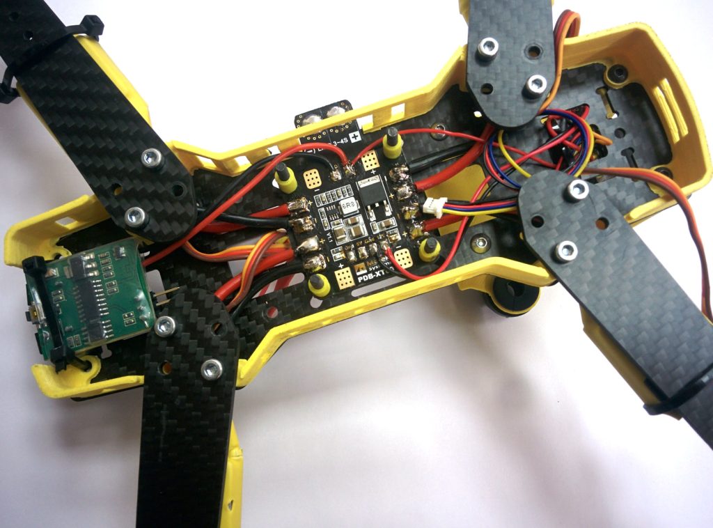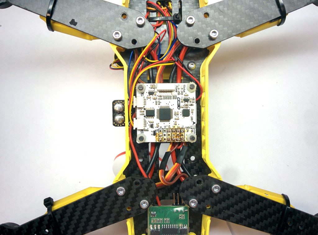 Обычно всю электронику устанавливают на дно, но наоборот поставили все вверх ногами. На полностью собранном коптере это позволяет просто снять нижнюю крышку и получить доступ ко всей электронике.